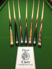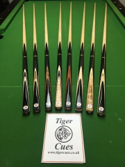 All in the range are hand made with genuine Canadian maple and African ebony cues. We have cues built to be both Pool cues with tips around 8.5mm is size, and also snooker cues with tip sizes ranging between 9mm and 10mm. All the cues include a 6" mini butt extention in with the price listed below.